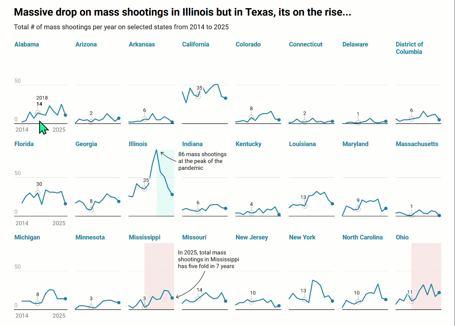 My first official data graphic using Datawrapper, this tool is worth learning. Small multiples with colored reference bands along with a nice interactive feature: synchronized tool-tip labels on the same data point across all multiples. Punctual annotations have also been added to emphasize the massive drop on mass shootings in the state of Illinois while there’s an upward trend in Texas.