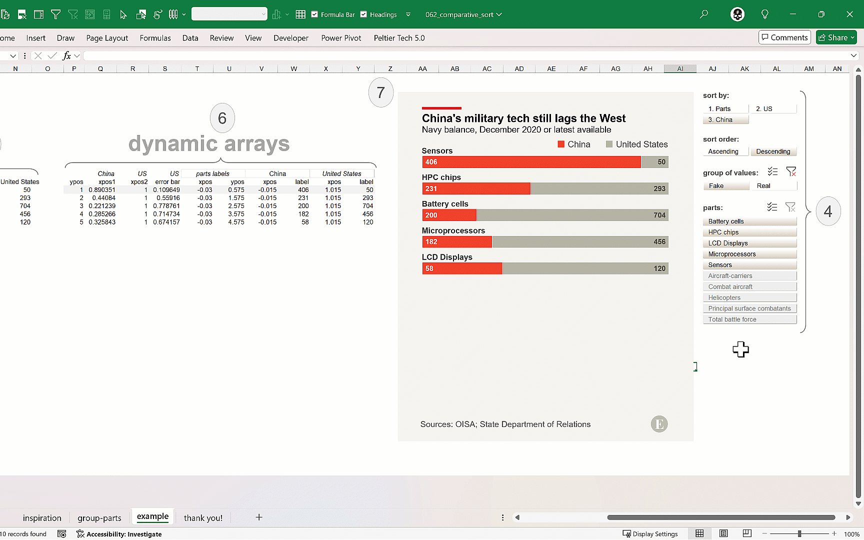 A simple interactive example for educational purposes to educate others on different types of encodings along with some interactivity like, switching the encoding, highlighting items of interest, changing the placement of the data labels, filtering the data (with pivot table slicers!), sorting the axis by the items or values in ascending or descending order, and also “losing” or fixing the scale of the horizontal axis.